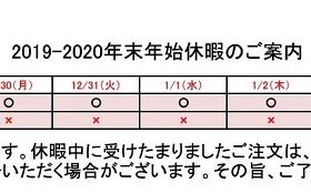 【2019-2020 年末年始休暇のご案内】 誠に勝手ながら、2019年12月28日(土)より2020年1月5日(日)まで休業致します。年末による物流…